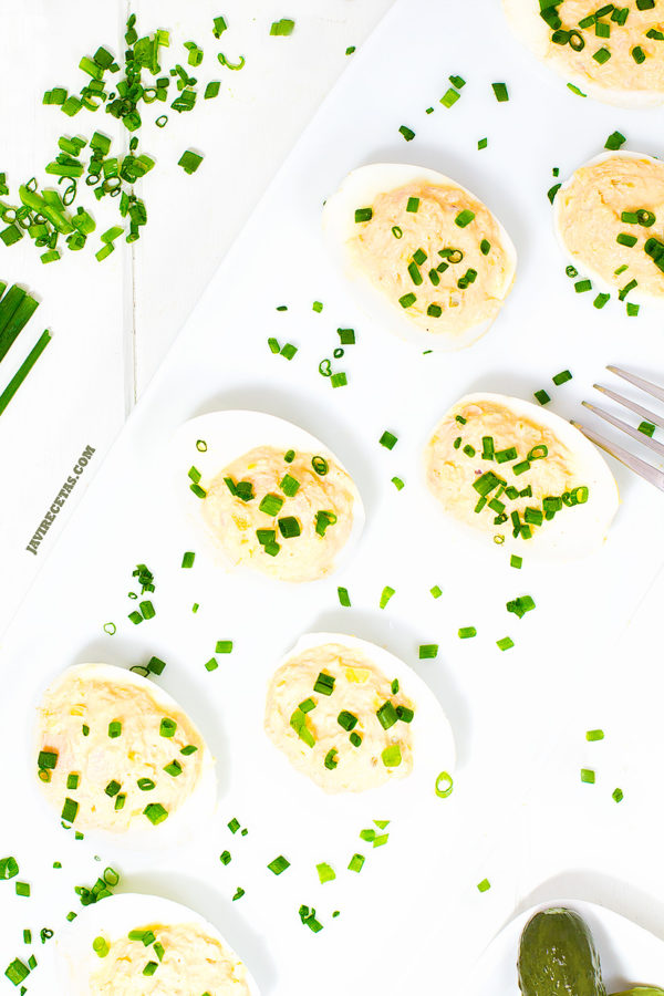 Antes de servir corta finamente un poco de cebollino y esparcelo por encima de los huevos rellenos de atún. El cebollino le dará un toque más de sabor y sobre todo color para que queden más vistosos. Y eso es todo …. fuera de la cocina y a comer!!!