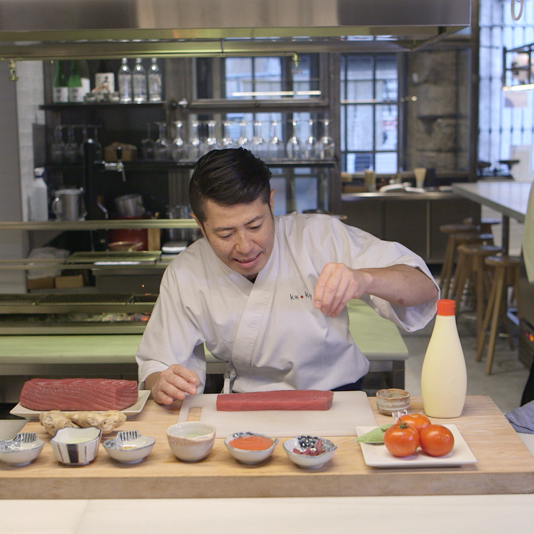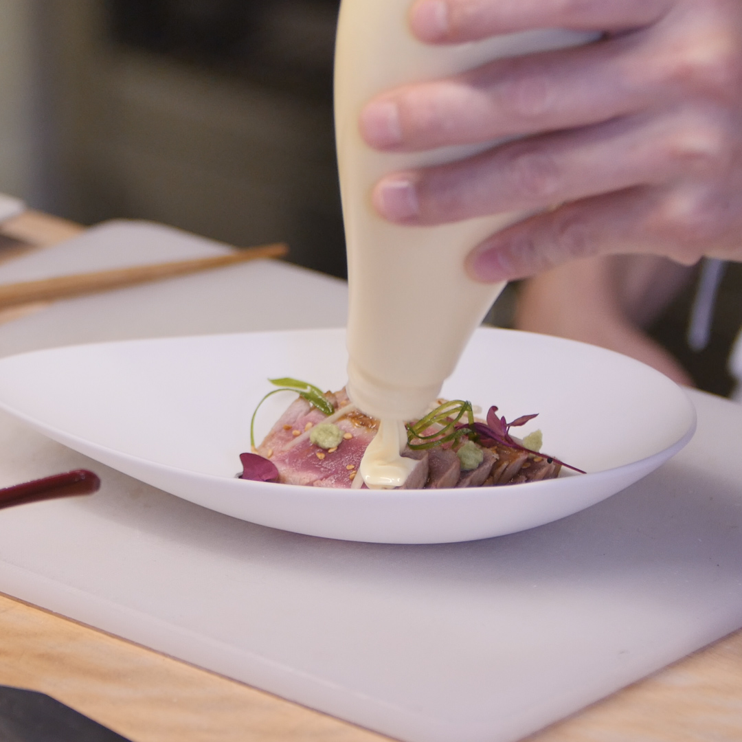 Tataki de atún con tomate rallado,gelatina de ponzu,wasabi y kewpie