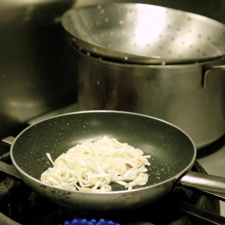 Primero calentamos el aceite, ajo y guindilla en una sartén y a continuación salteamos la pasta.