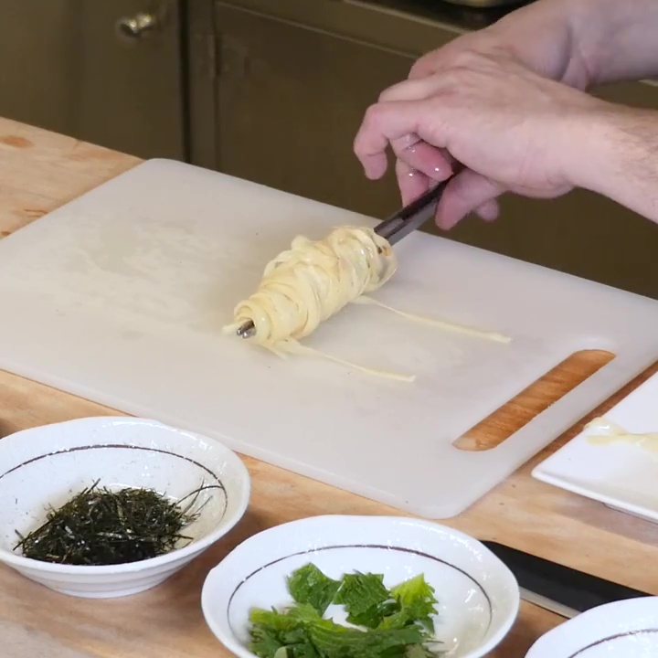 Colocamos el rollo de la pasta en un plato y decolamos con el shiso y la piel de mentaiko.