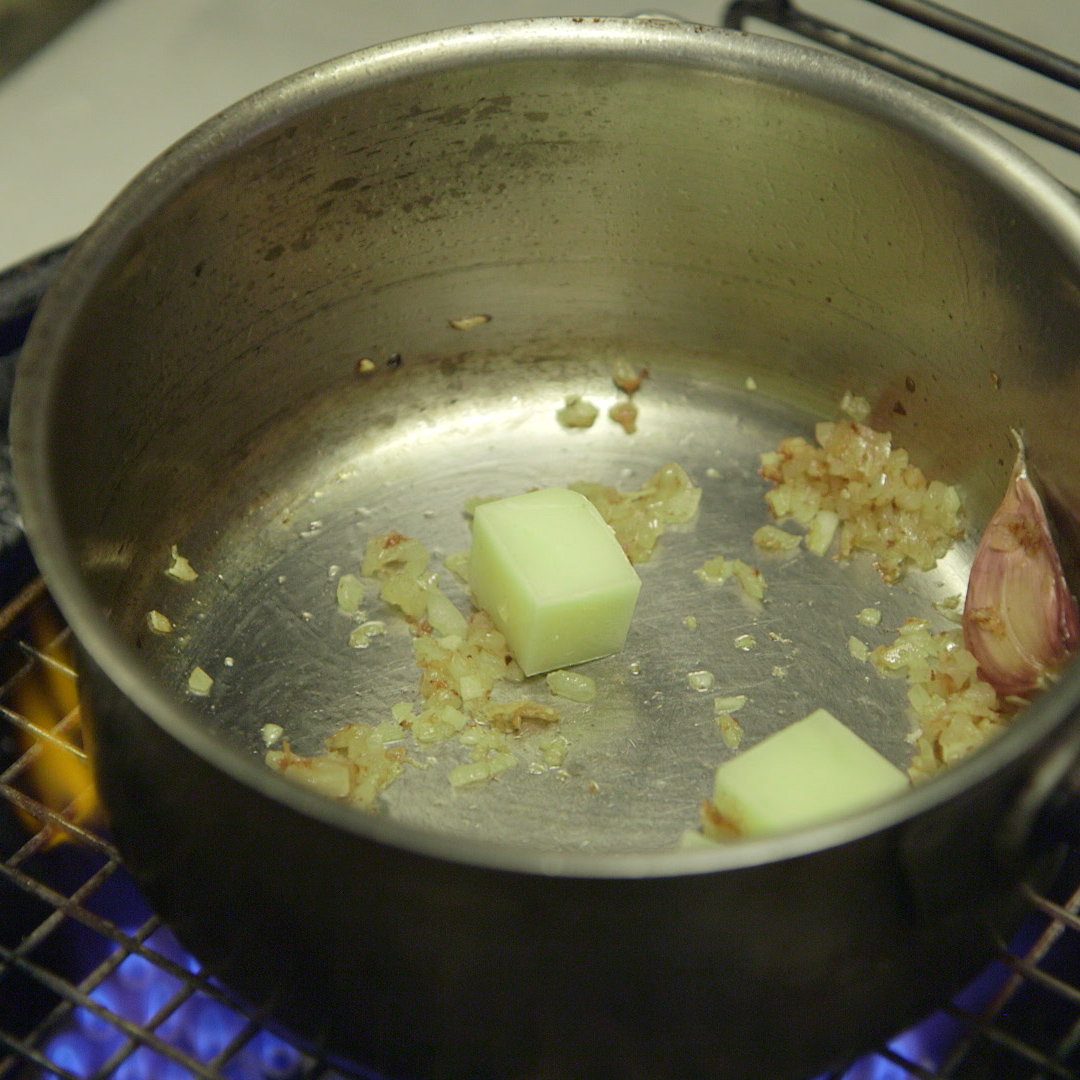 Aggiungere un pezzo d'aglio, acqua, patate, purea di pomodoro, sesamo nero, peperoncini e sale.