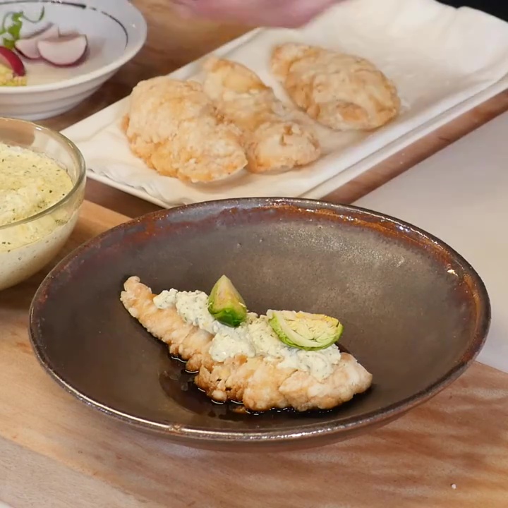 Impiattare insieme con la salsa tartara e la salsa Namban.