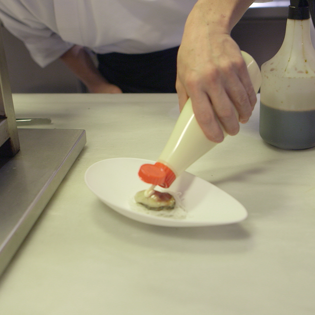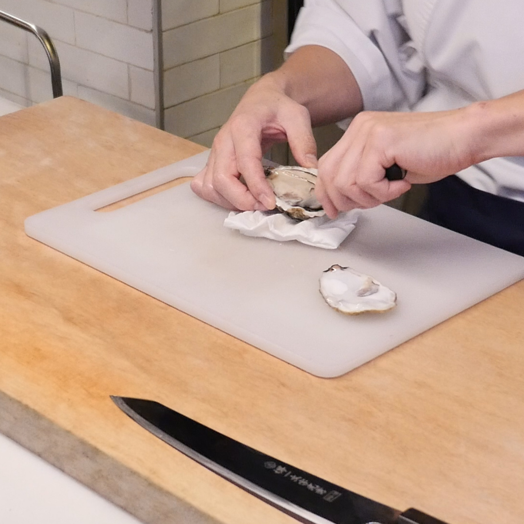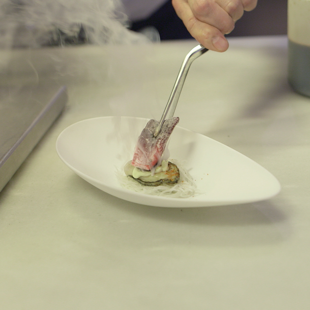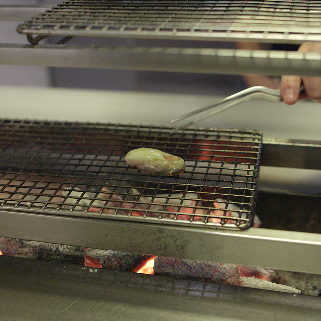 Take a piece of red-hot charcoal and use it to sear the mayonnaise and oyster.