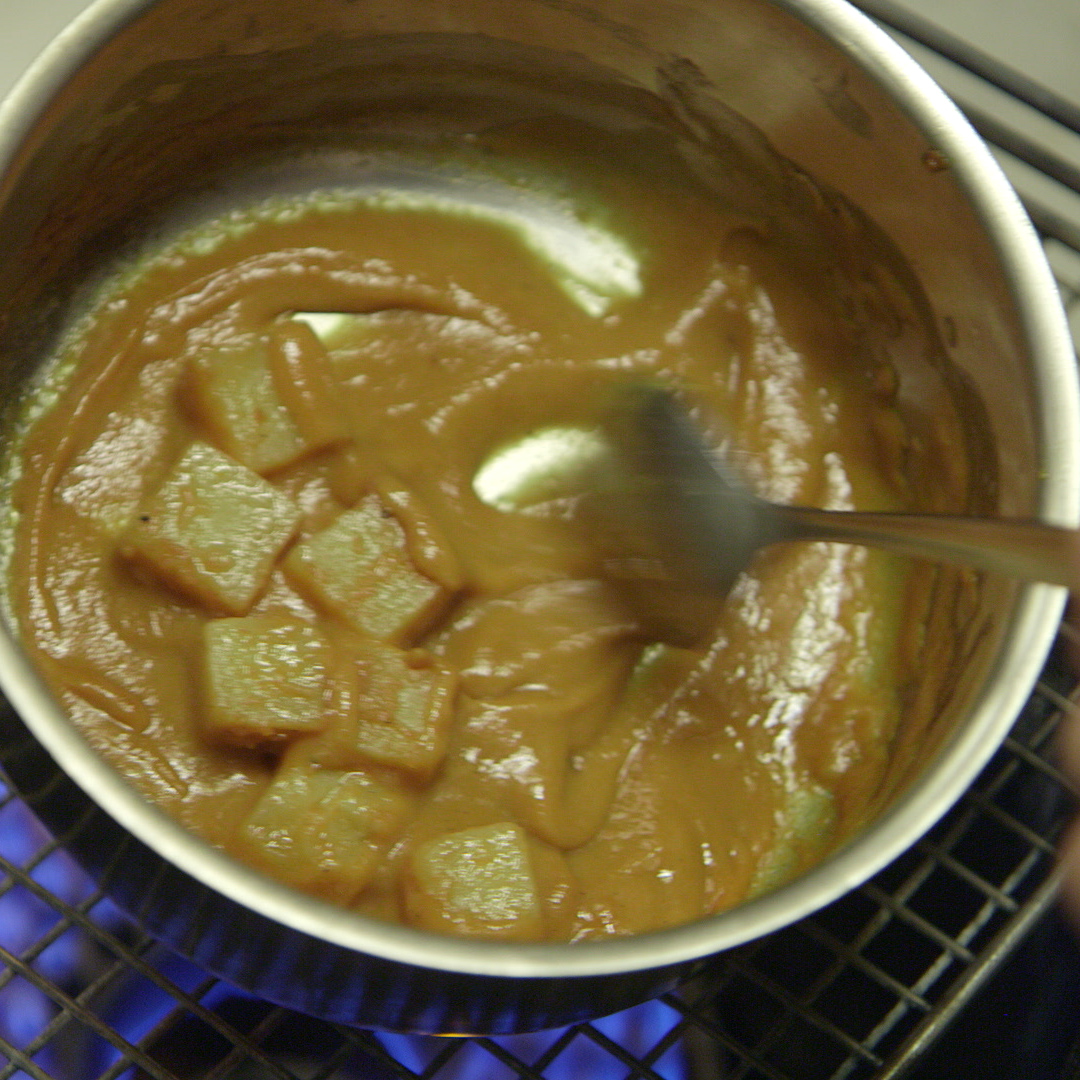 - Add the whole garlic, then water, potato, tomato paste, black sesame, chili, and salt.