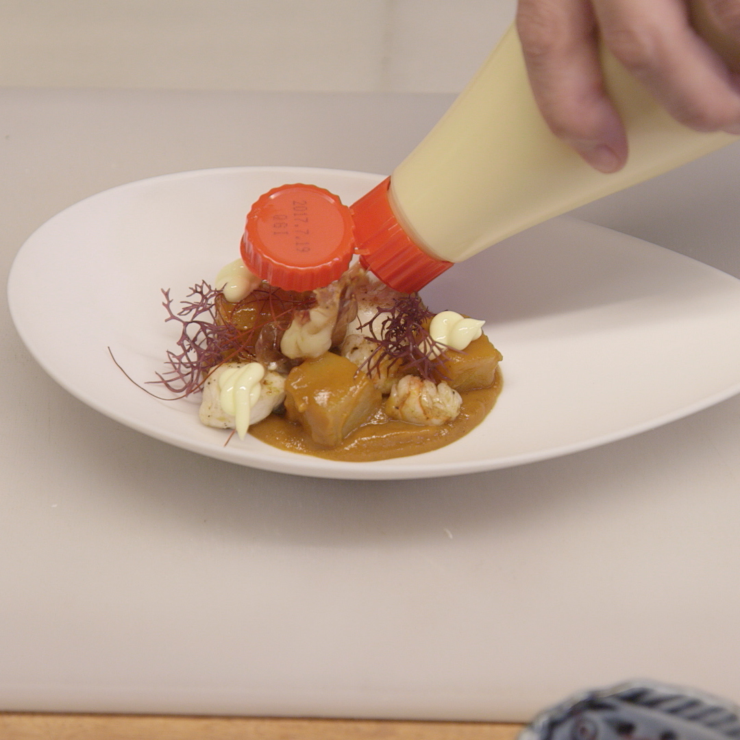 Garnish the dish with the seaweed, chili, and other ingredients.